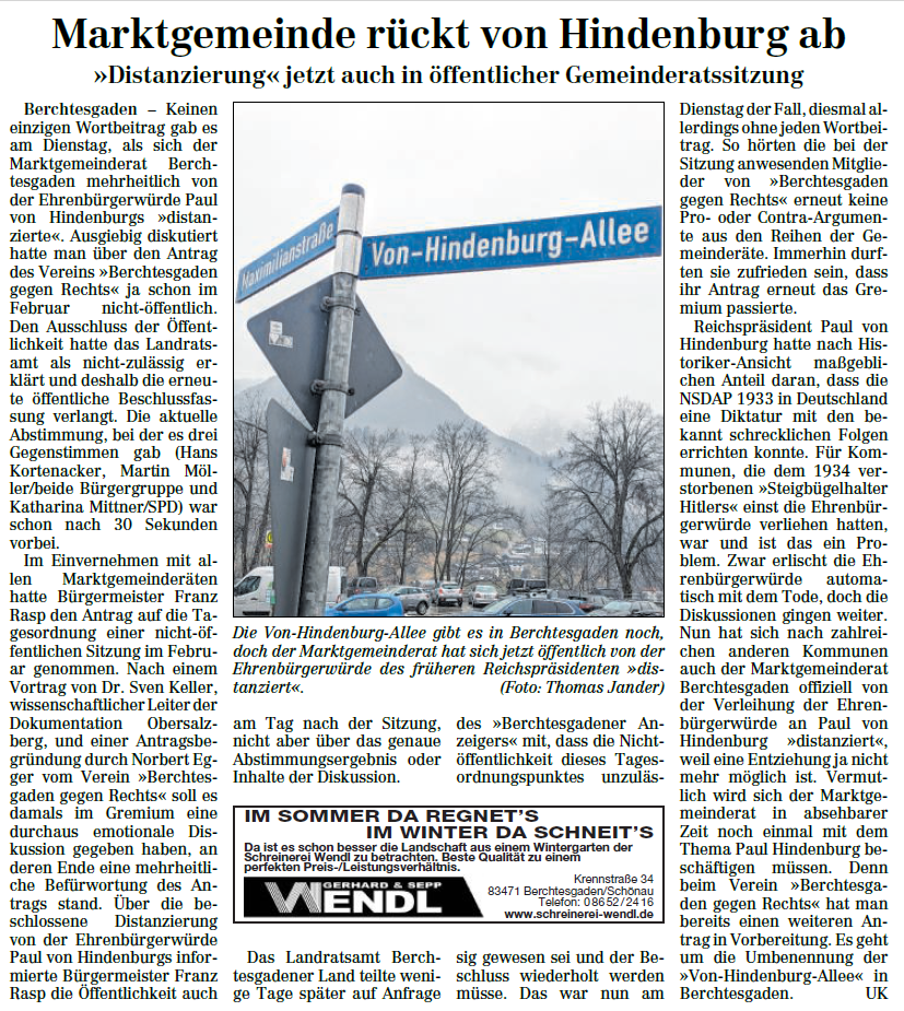 "Intensive Diskussion über den Steigbügelhalter Hitlers" - Marktgemeinderat Berchtesgaden distanziert sich von Ehrenbürgerwürde Hindenburgs