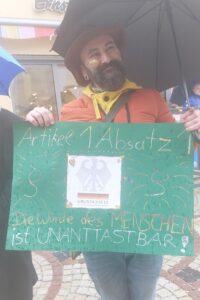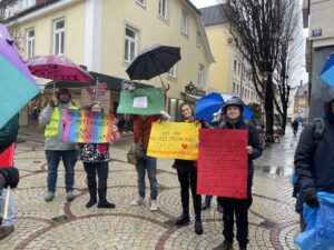 Wir haben uns zwar auch mit einigen abfälligen Bemerkungen und Schimpftiraden auseinandersetzen müssen, aber dennoch war die Stimmung super. Am Ende waren wir sehr stolz, dass wir – trotz strömenden Regen und 4 Grad Kälte – länger ausgehalten haben als die AfD-ler, obwohl diese unter einem Pavillon standen.
